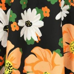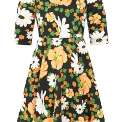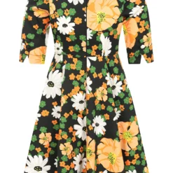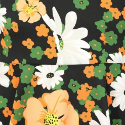 Bold and bright, this floral swing is bursting with fresh colours for the autumn/winter season. A palette of greens, whites, oranges and yellows, all on a dark black base, creating an exciting array of colours for the darker months. The sweet boat neckline with notched front sits neatly on top of the bouquet of the florals on the bodice. This style is easy to wear with its longer sleeves and flowing skirt. Making is perfect for playing all day long!