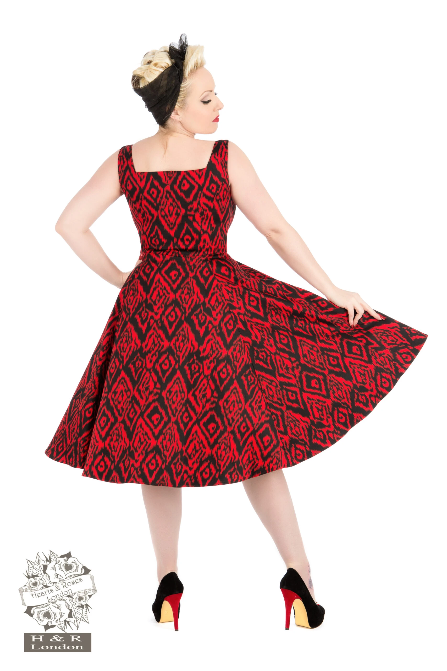 Tiki time! H&R London’s Tiki Party Dress has got you covered. This festive swing dress in a delightful tribal tiki print is just the frock to have fun in. Red and black tribal tiki print on a stretchy cotton swing dress, this dress a has a full swing skirt and an adorable black bow at the top on the neckline. Dress is sleeveless, with a slight boat neck neckline, princess seamed, with a full swing skirt that flares out at the waist. Dress hits just below the knee, and zips up the side for a flattering fit.