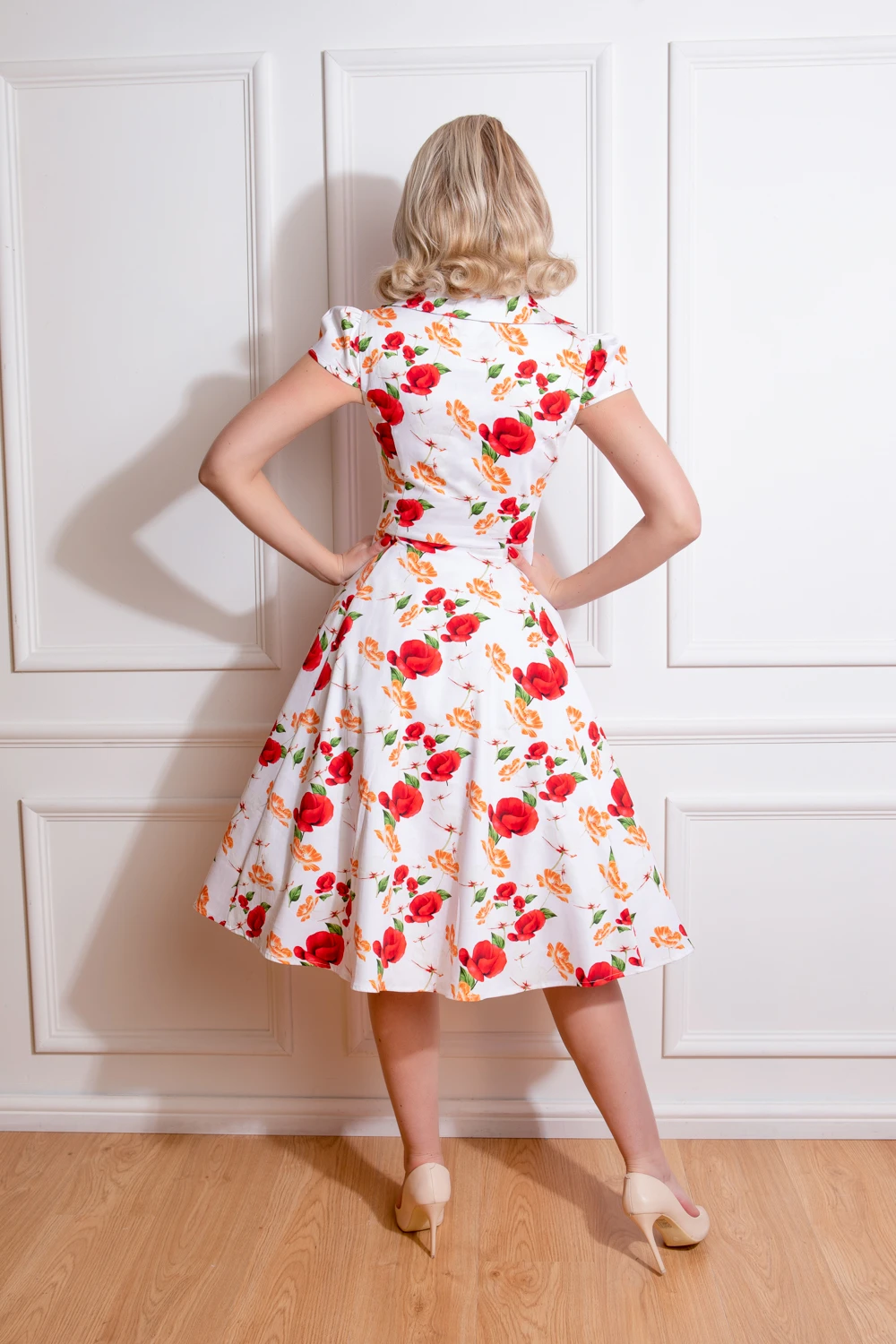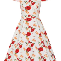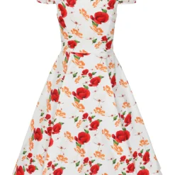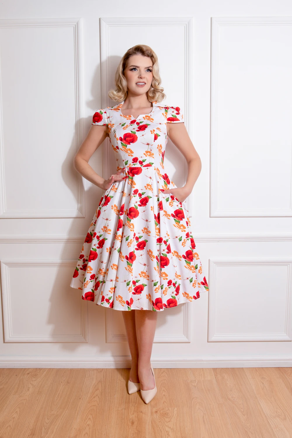 A colour combo fit for summer events, this brand new swing dress will have you looking the bell of the ball. Our new Tracy Floral Swing Dress has a gorgeous bright white base topped with a fabulous floral motif of dark red petals and orange mini flowers. This style is perfect for all with its flattering round neckline with front notch and collar, gathered cap sleeves and fitted bodice. The full swing skirt is reminiscent of the 1950’s which we all know and love. We haven’t forgotten the super handy hidden side pockets to hold all your bits and bobs. Just pair with your shoes of choice and you’re all set to go!