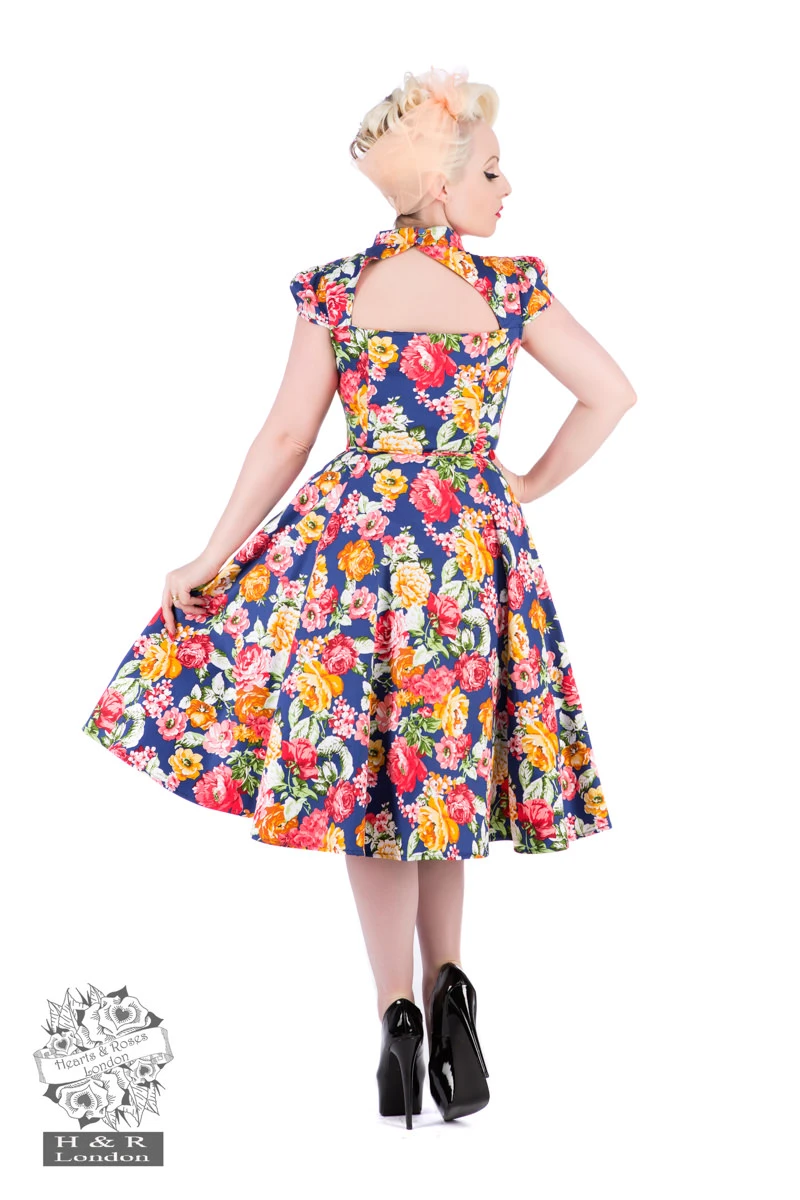 H&R’s beautiful new floral style on our signature luxurious fabric! Our dress has a blue background with a multi-coloured floral pattern. Sweetheart cut-out neckline with banded collar, cap sleeves, and zip at side to close.