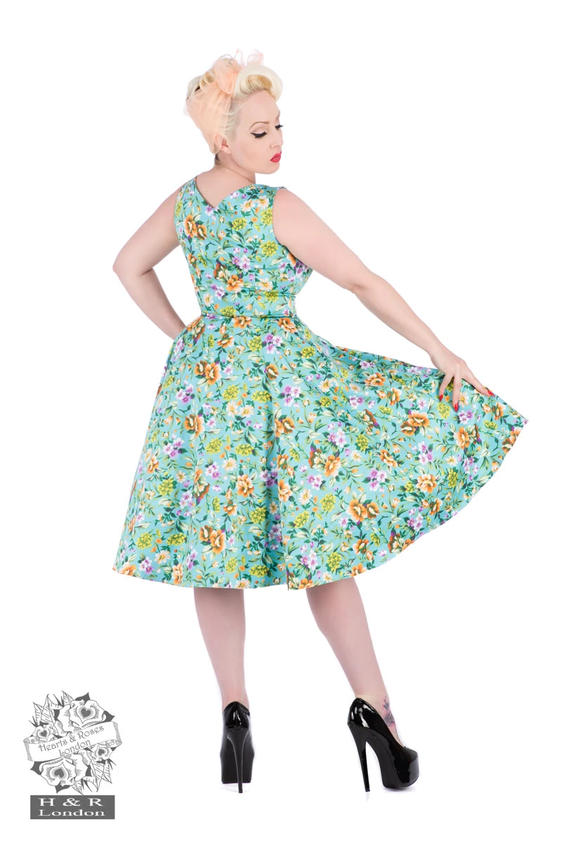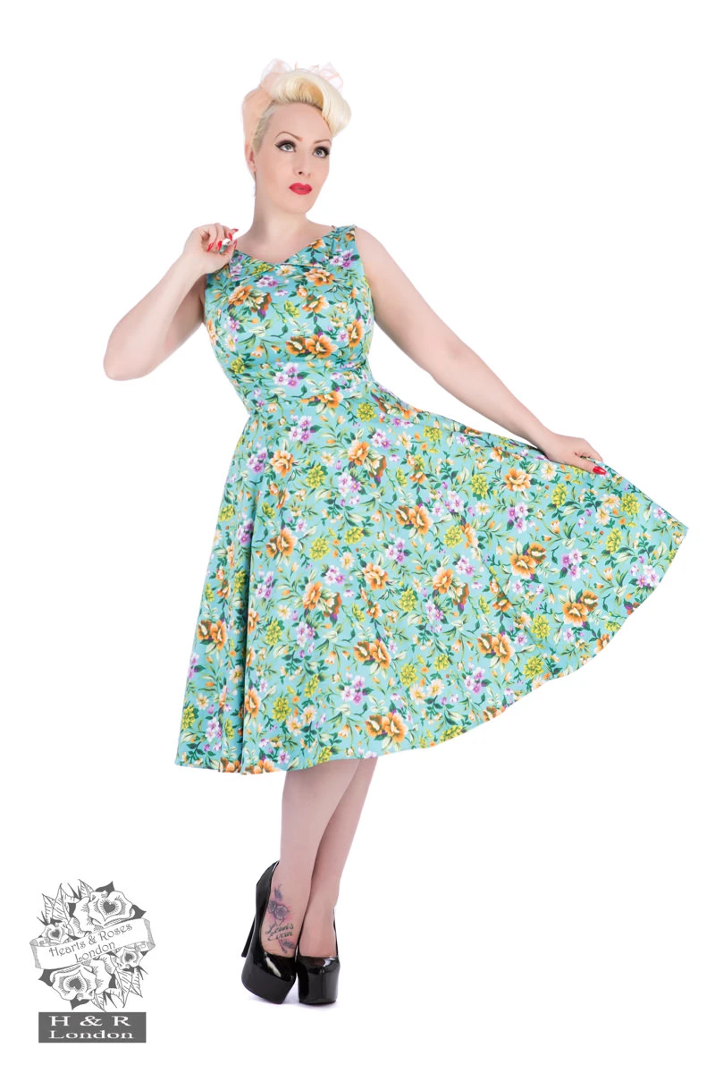 Hello, World! Meet Camilla, H&R London’s bestselling day dress! Nothing can overstate the Camilla Dress beauty. This wondrous turquoise dress is one of the most classic pieces from the collection. The delicate floral print of orange and lilac blossoms set on a sleeveless day dress is pinup-perfect, while the front fold over collar adds just a dash of whimsy. Slight v neckline in back shows the nape of the neck. Dress has a full swing skirt, hits below the knee. Dress zips up the side for a flattering fit.