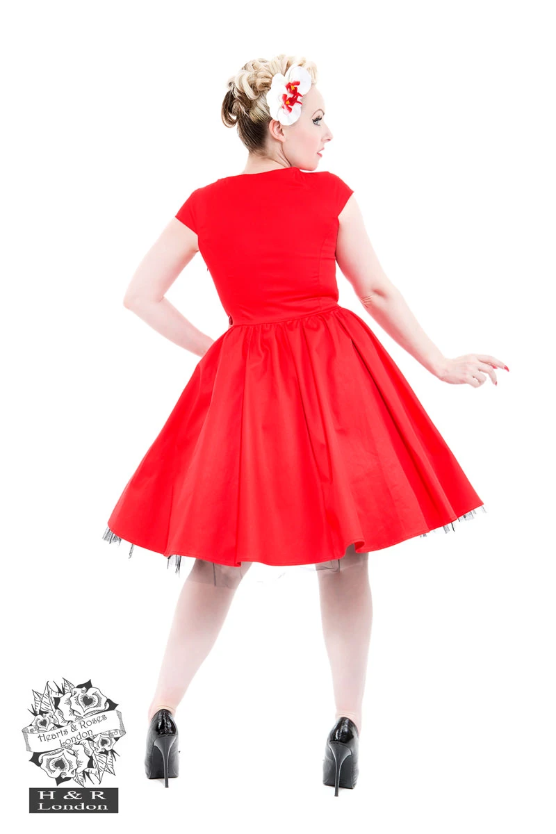 The perfect little dress made a bit daring by a flash of “V”! The Vivian Dress from H&R London is both simple and sweet. Made out of a soft, stretchy cotton, this cap sleeve swing dress has a soft v neckline with a contrasting band of red or black. The bold red and black v draws the eye upward to your pretty face, while the built-in black petticoat gets those legs some attention! Dress has a full swing skirt that flares at the waist.