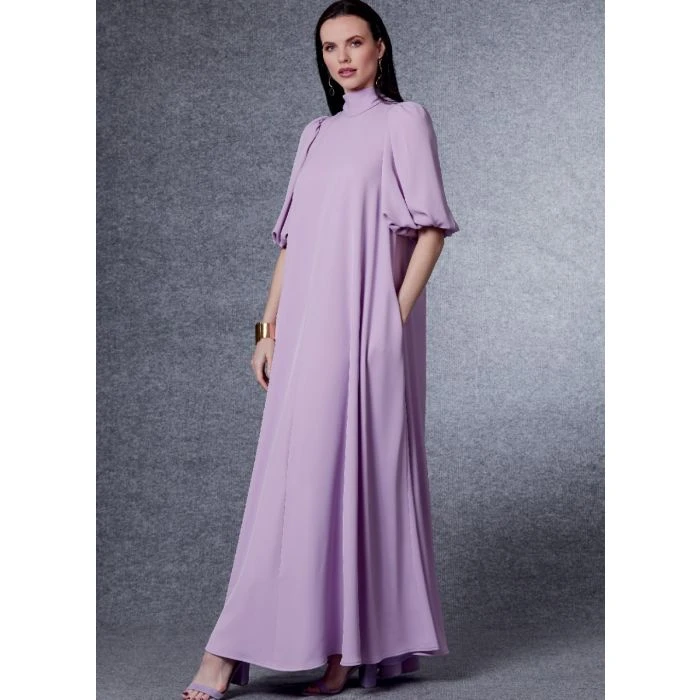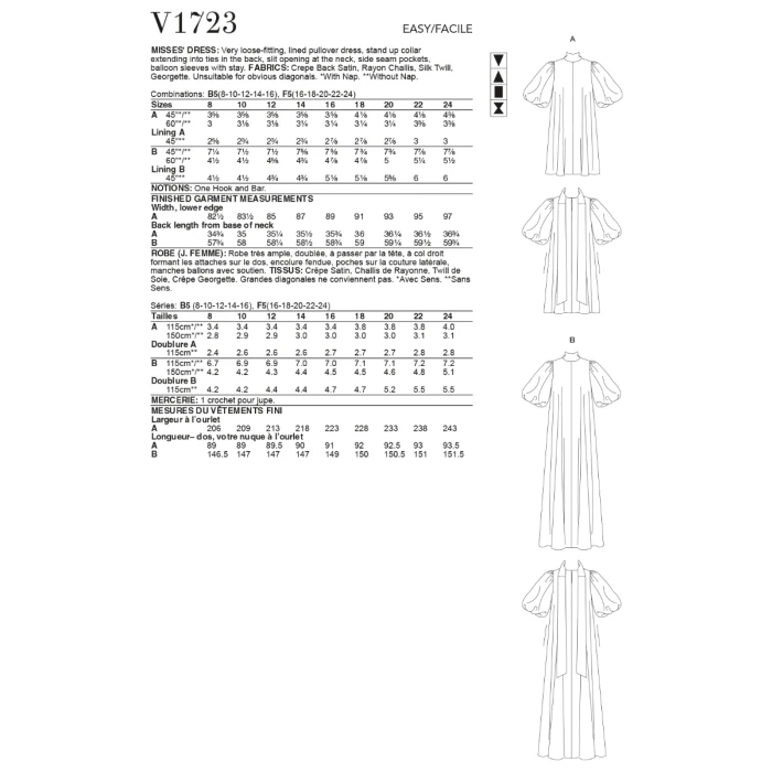 Vogue Sewing Pattern 1723 (F5) – Very loose-fitting, lined pullover dress, stand up collar extending into ties in the back, slit opening at the neck, side seam pockets, balloon sleeves with stay. Shop the Complete Vogue Sewing Pattern collection, including Vogue Sewing Pattern 1723 (F5) at Abakhan. FREE Delivery Available & Earn Loyalty Reward Points on All Purchases. Size 16-24.