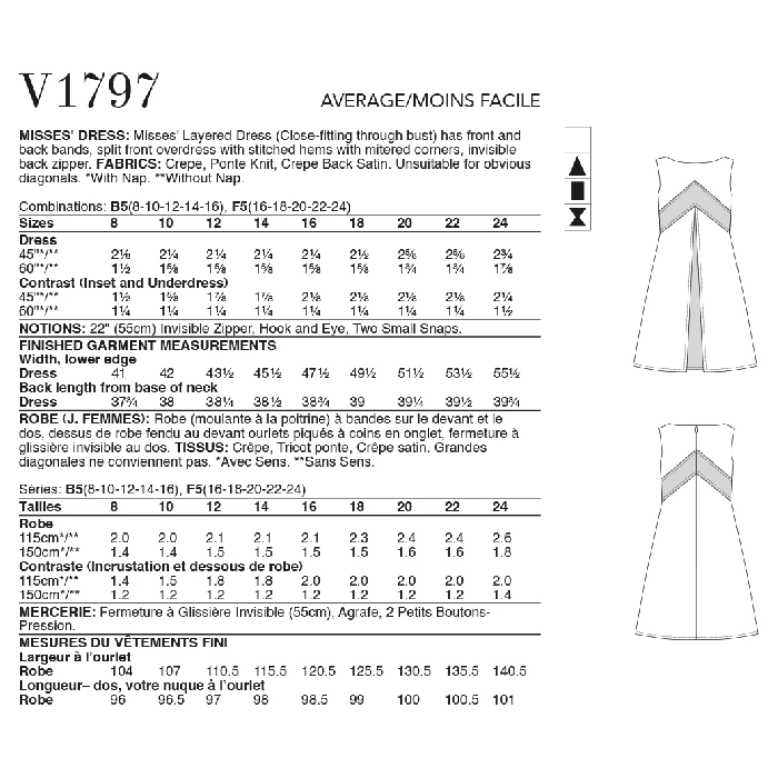Vogue Sewing Pattern 1797 (B5) – Layered dress has front & back bands split front over dress with stitched hems with mitered corners invisible back zipper. Shop the Complete Vogue Sewing Pattern collection, including Vogue Sewing Pattern 1797 (B5) at Abakhan. FREE Delivery Available & Earn Loyalty Reward Points on All Purchases. Size 16-24.