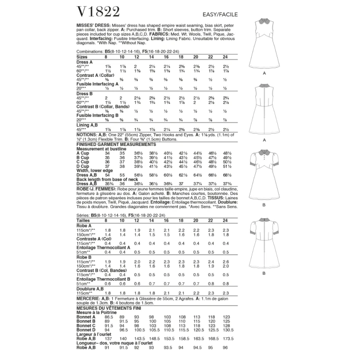 Vogue Sewing Pattern 1822 (F5) – Dress has shaped empire waist seaming, bias skirt, peter pan collar, back zipper. A: purchased trim. B: short sleeves button trim. Separate pieces included for cup sizes A, B, C, D. Shop the Complete Vogue Sewing Pattern collection, including Vogue Sewing Pattern 1822 (F5) at Abakhan. FREE Delivery Available & Earn Loyalty Reward Points on All Purchases. Size 16-24.