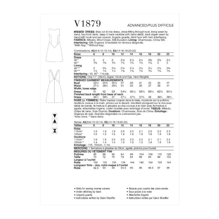 Vogue Sewing Pattern 1879 (A5) – Bias cut A-line dress, close-fitting through bust, lining sewn by hand, has front darts, deep-V back neckline with band detail, back zipper sewn by hand with hook & eye closure, lingerie guards, blind hem with hem interfacing & hem weights. Shop the Complete Vogue Sewing Pattern collection, including Vogue Sewing Pattern 1879 (A5) at Abakhan. FREE Delivery Available & Earn Loyalty Reward Points on All Purchases. Size 6-14.