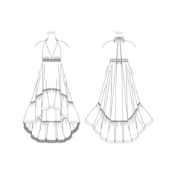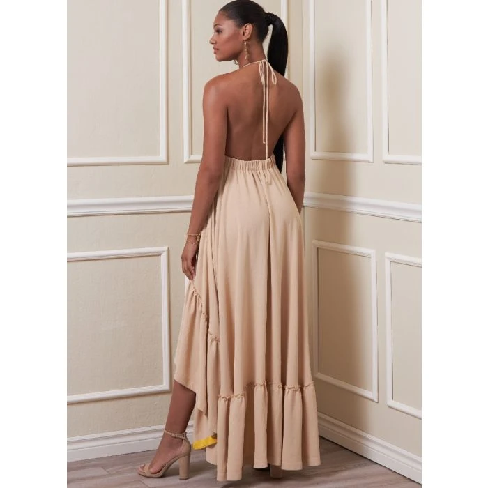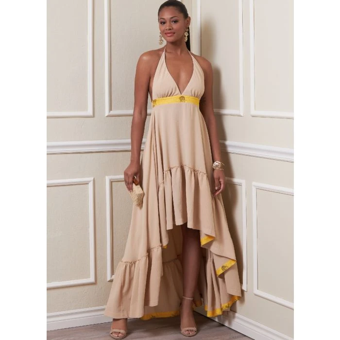 Vogue Sewing Pattern 1881 (Y) – Halter neck dress has narrow neck ties, plunging V-neck bodice with gathers under the bust, empire waist seaming with contrast band, flared skirt (cut crossgrain) with high-low hemline & ruffle finished with contrast hem facings & side seam pockets. Shop the Complete Vogue Sewing Pattern collection, including Vogue Sewing Pattern 1881 (Y) at Abakhan. FREE Delivery Available & Earn Loyalty Reward Points on All Purchases. Size XS-M.