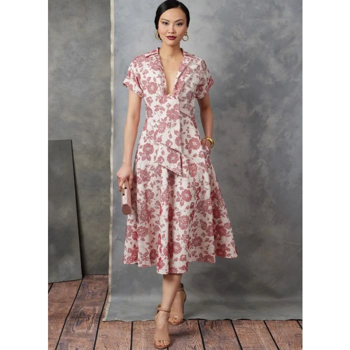 Vogue Sewing pattern V1898 is a lined dress which has a plunging neckline with tie, notch collar with collar stand, sleeves with turn back cuffs, invisible back zipper and hook and eye closure, side seam pockets, flared skirt (cut crossgrain) has narrow hem. Designed by Badgley Mischka.