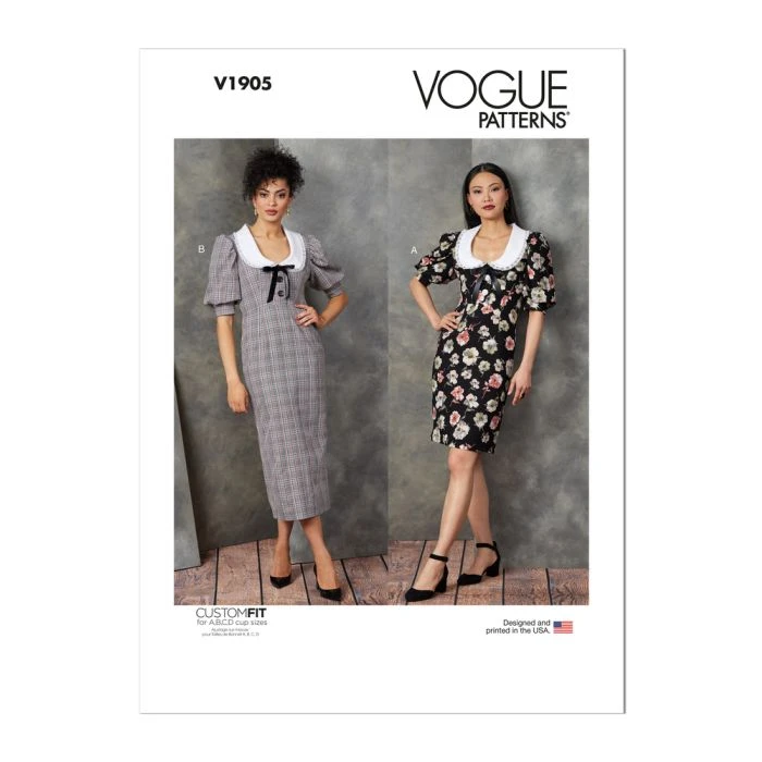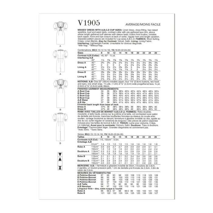 This Vogue Sewing Pattern V1905 (B5) Misses’ Dress is a Lined dress, close-fitting, has raised waistline, bust and waist darts, contrast collar with pre-gathered lace trim, above elbow length gathered puff sleeves with sleeve head, button front bodice, invisible back zipper, hook and eye closure at back of collar, regular hem and length variation. Separate pattern pieces are included for cup sizes A, B, C, D.