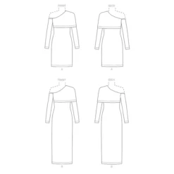 This Vogue Sewing Pattern V1906 (B5) Misses’ Dress has a close-fitting, pullover style knit column dress has asymmetric neckline with overlay, long sleeves, stitched hems and length variations.