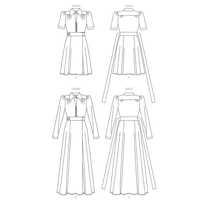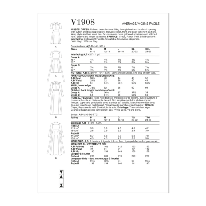 This Vogue Sewing Pattern V1908 (A) Misses’ Dress is a unlined dress is close fitting through bust and has front opening with button and bias loop closure. Includes collar, front and back yoke with gathers. Wrap style skirt has waist ties. Set-in sleeves have gathered shoulders and stitched hem. Sleeve and length variations.