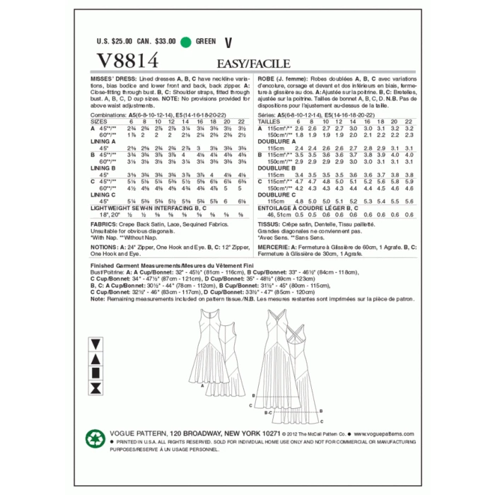 Vogue Sewing Pattern 8814 (A5) – Lined dress has neckline variations, bias bodice/lower front & back, & back zipper. A: close-fitting through bust. B & C: shoulder straps, fitted through bust. A, B, C, D cup sizes. Note: no provisions provided for above waist adjustments. Shop the Complete Vogue Sewing Pattern collection, including Vogue Sewing Pattern 8814 (A5) at Abakhan. FREE Delivery Available & Earn Loyalty Reward Points on All Purchases. Size 6-14.