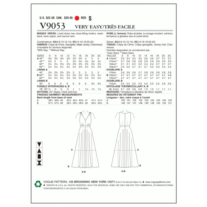 Vogue Sewing Pattern 9053 (A5) – Lined dress has close-fitting bodice, waistband & back zipper. Narrow hem. Shop the Complete Vogue Sewing Pattern collection, including Vogue Sewing Pattern 9053 (A5) at Abakhan. FREE Delivery Available & Earn Loyalty Reward Points on All Purchases. Size 6-14.