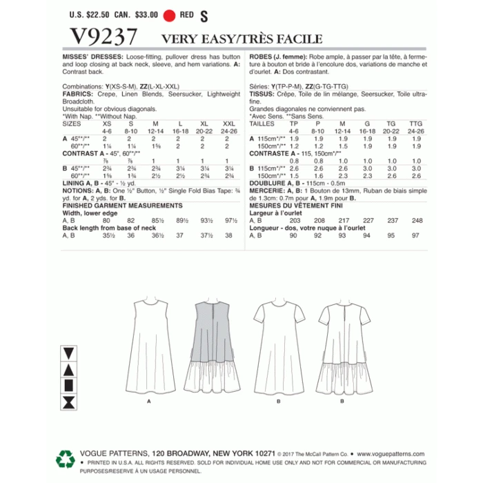 Vogue Sewing Pattern 9237 (Y) – Loose-fitting pullover dress has button & loop closing at back neck, sleeve & hem variations. A: Contrast back. Shop the Complete Vogue Sewing Pattern collection, including Vogue Sewing Pattern 9237 (Y) at Abakhan. FREE Delivery Available & Earn Loyalty Reward Points on All Purchases. Size S-M.