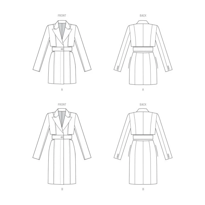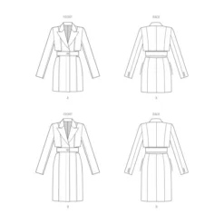 This Vogue Sewing Pattern V1936 (F5) Misses’ Blazer Dress has peak lapels, topstitching on side front seams, long two-piece sleeves with button trim, and shoulder pads. Dress features button closure at waistband, concealed button closure on skirt, waist cut-outs, side seam pockets, and length variations.