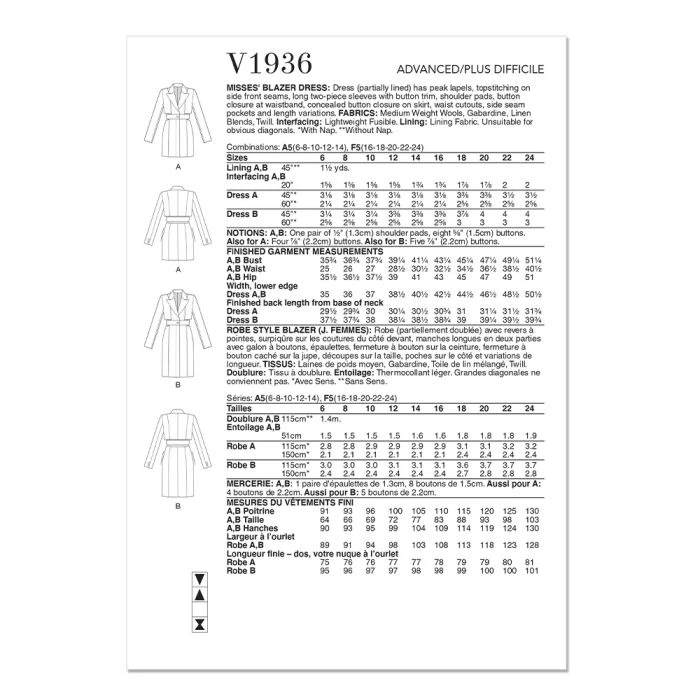 Be the first to review “Vogue Sewing Pattern V1936 (F5) Misses’ Blazer Dress 16-24” Cancel reply