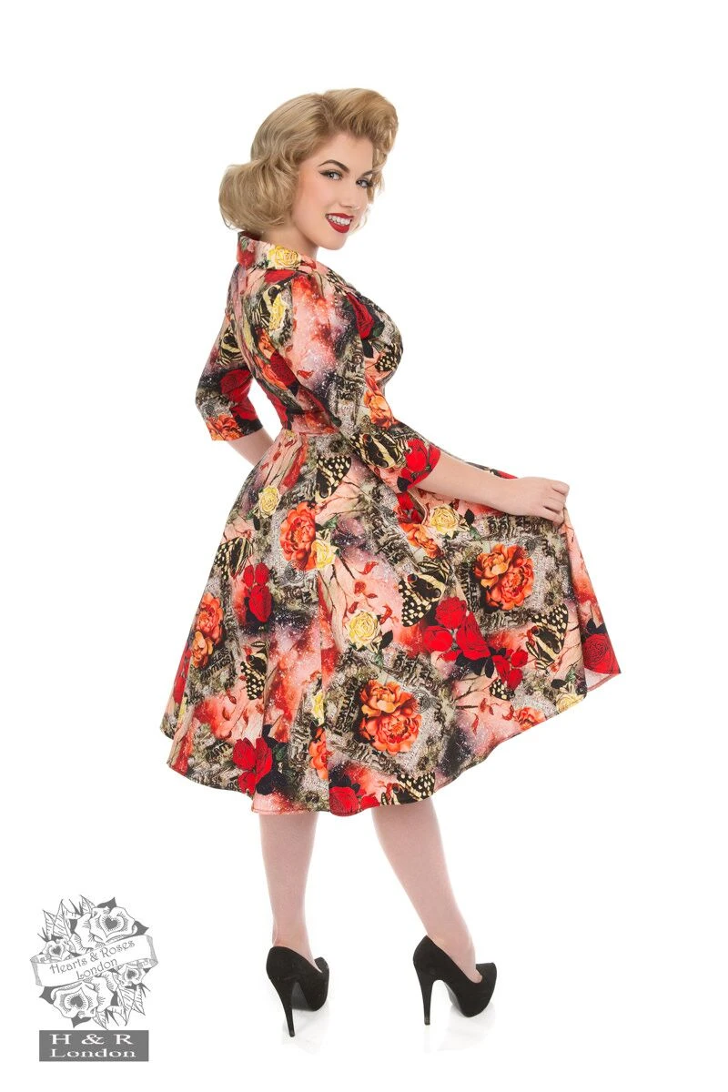 Wild roses are as charming and elegant to flaunt this winter. The sweet melody of the festive season has begun and this design is a true festive piece to add to your wardrobe collection, brought to you by our in-house designers at Hearts & Roses. Again we have designed a 3D print of large black and yellow butterflies, flying around the gorgeous prints of bold red roses. With Xmas and the New Year around the corner, we wanted to add another formal addition to our collection. The collar features a divine shawl neckline and also features some lovely in seam side pockets. We’re all going wild for this dress