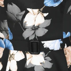 We are so excited to share with you our brand new Zoe Floral Swing Dress. Scattered with large scale florals in sophisticated hues of beige and blues, this print will turn heads this season. The shape is timeless, with its swing skirt floating down from the fitted bodice. The elegant neckline features a boat neckline shape with a front notch detail. Alongside the gathered ¾ length sleeves is a beautiful hem detail with decorative buttons and a sweet notch. The gorgeous 50s shape is tied together with the belt in self-fabric. Just pair this dress with your favourite flats or heels and you’re ready for your next event!